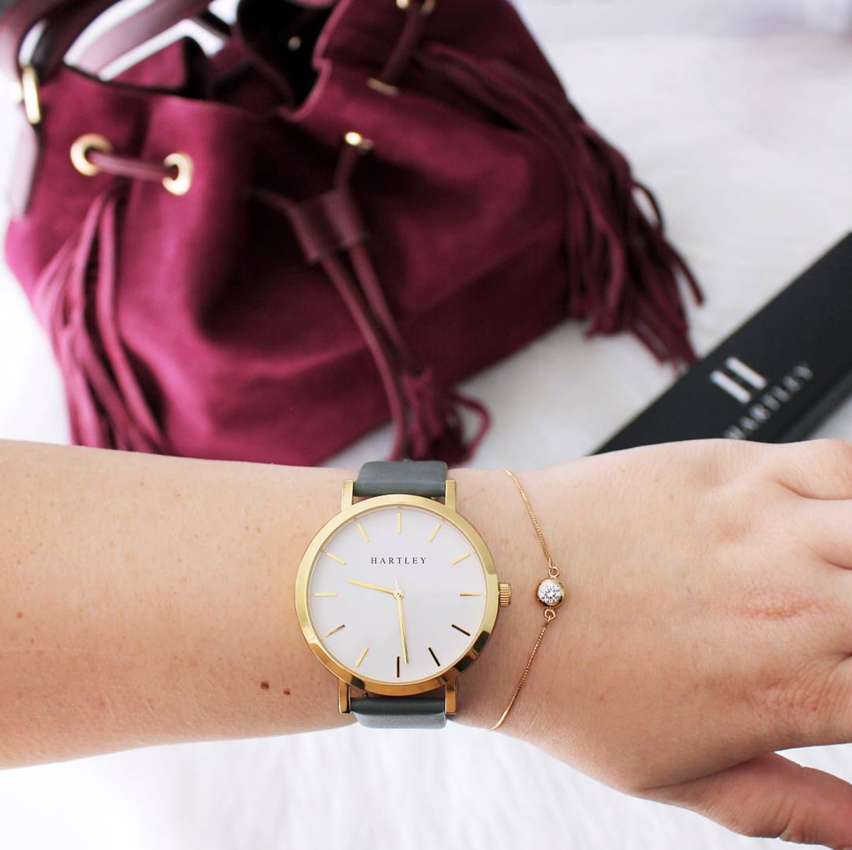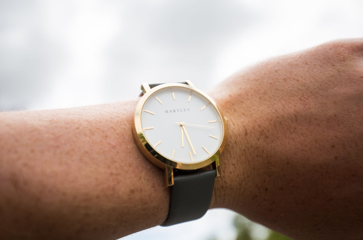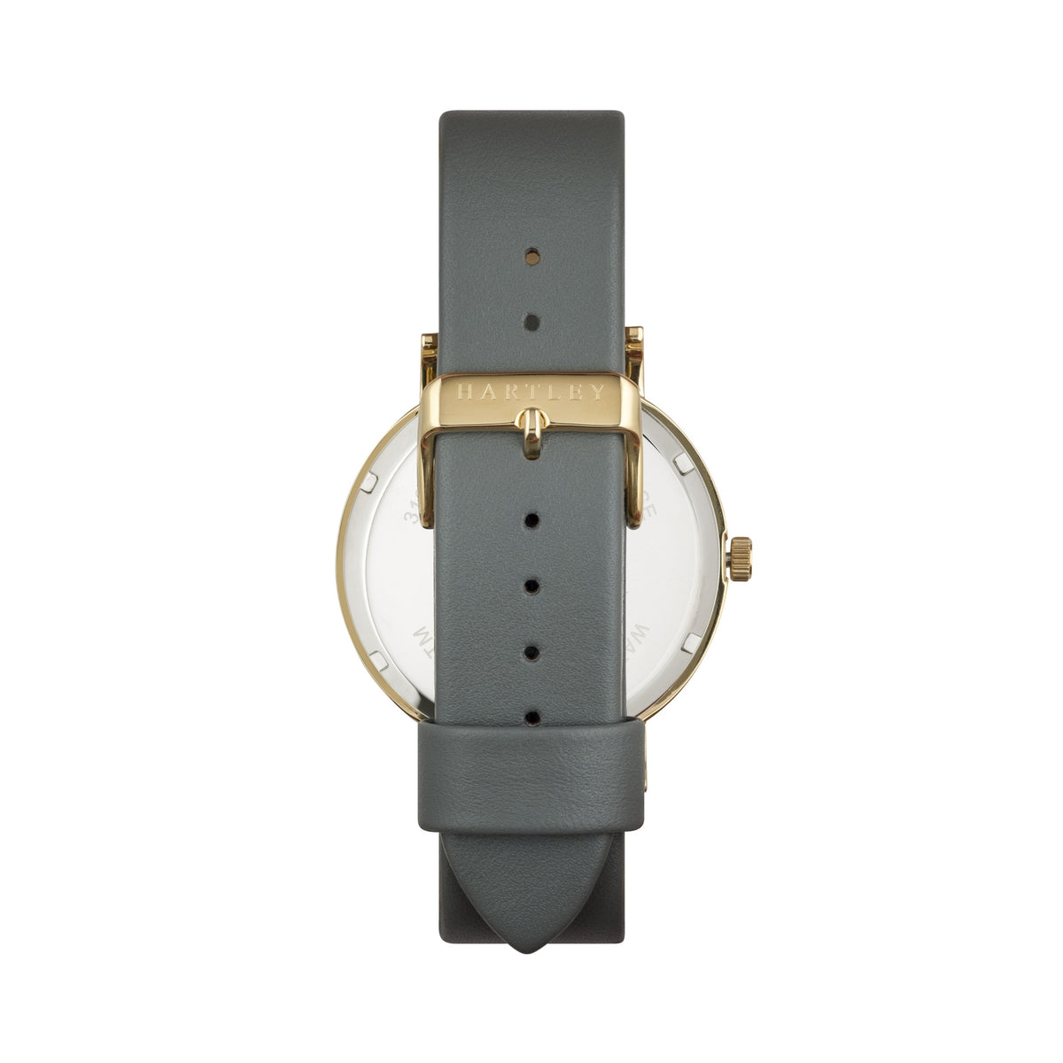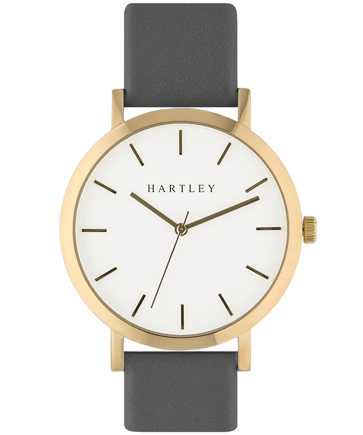 A simple & effective timepiece featuring polished gold dials and hands on a clean white face and striking grey leather band. Casual or formal, this timepiece suits every occasion.
