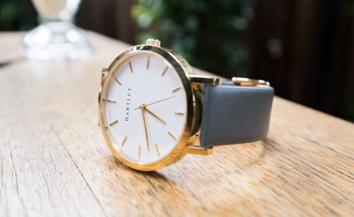 A simple & effective timepiece featuring polished gold dials and hands on a clean white face and striking grey leather band. Casual or formal, this timepiece suits every occasion.